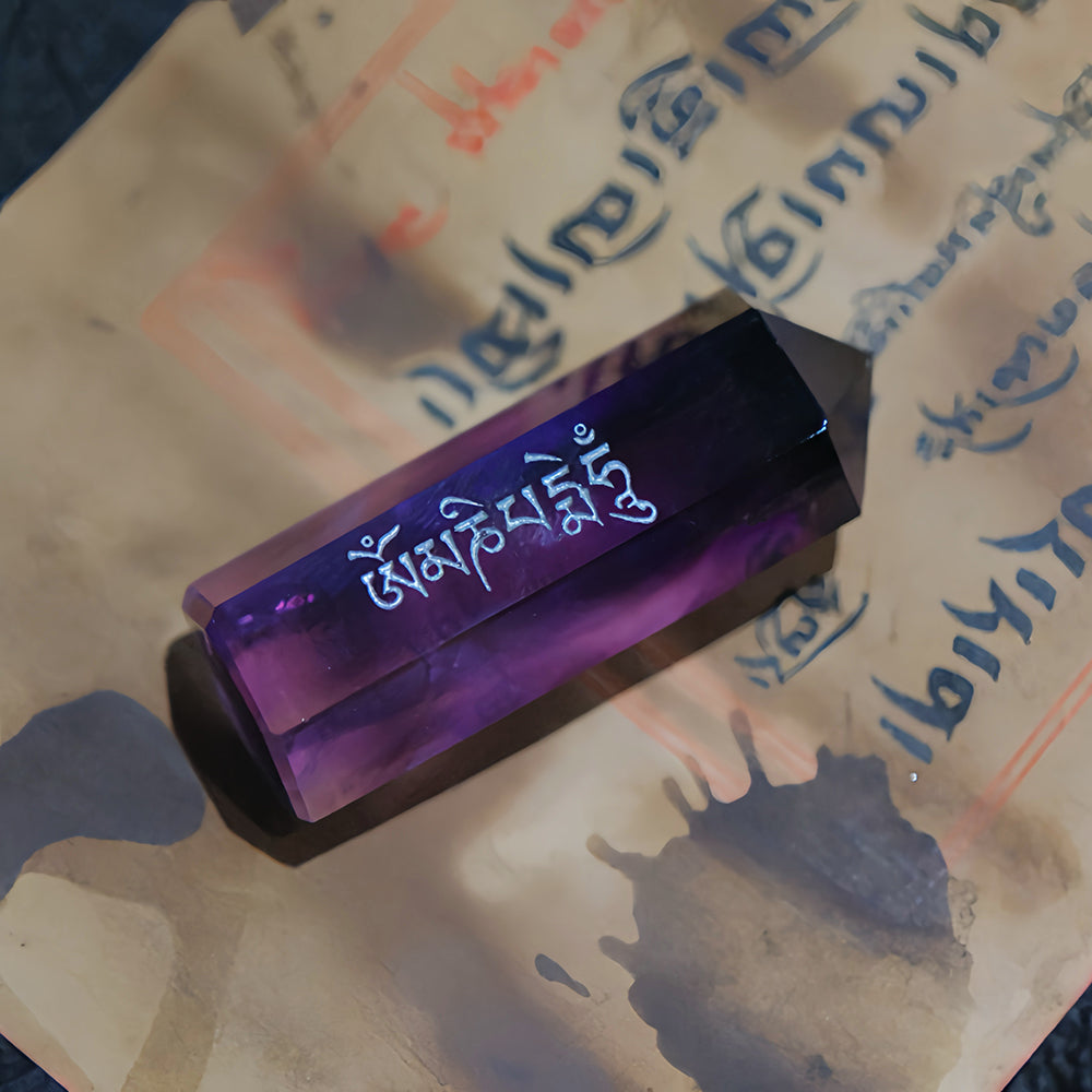 A sacred fusion of crystal energy and Tibetan mantra. This high-grade natural amethyst point is carved with the revered Tibetan six-syllable mantra Om Mani Padme Hum, invoking compassion, purification, and spiritual awakening.